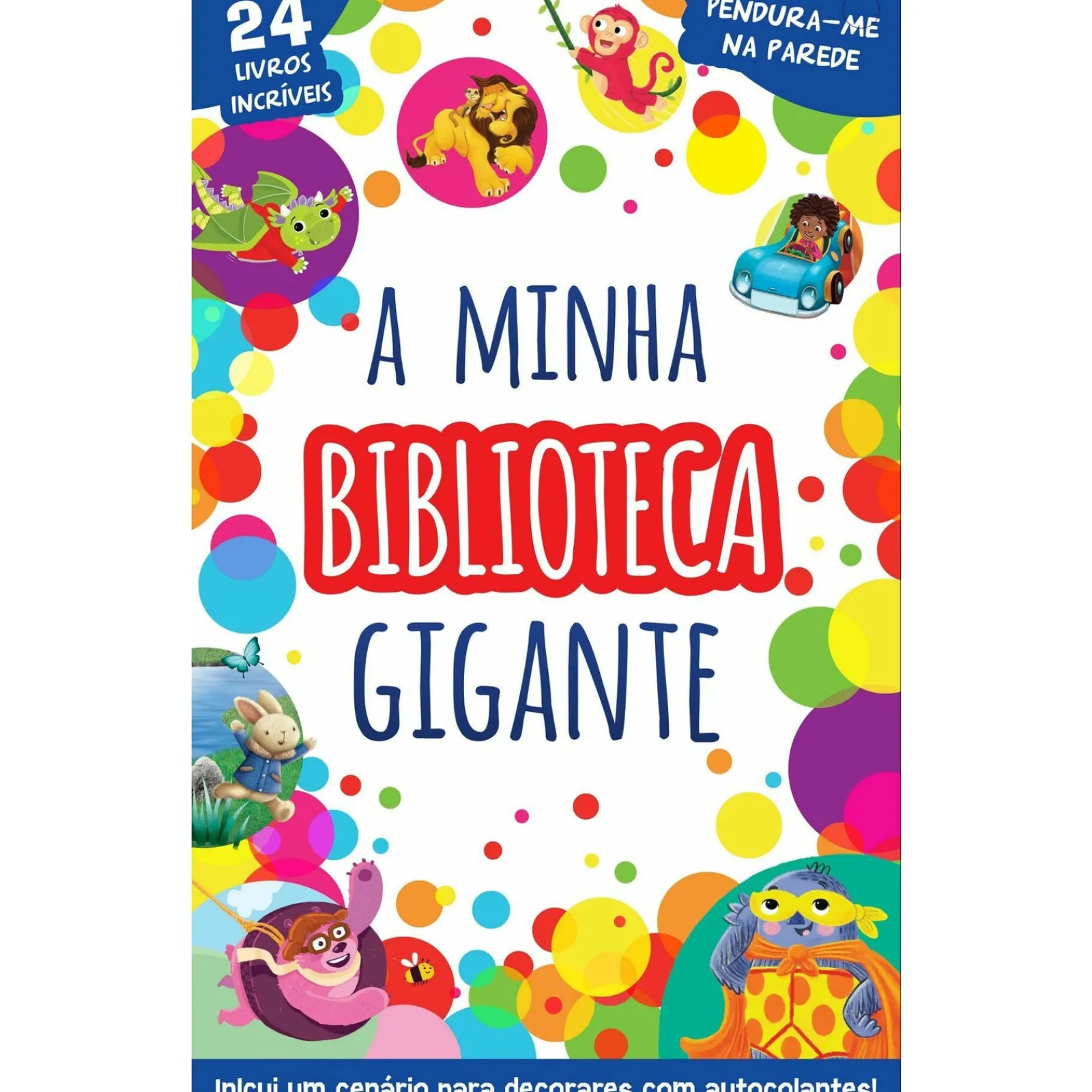 No interior, vais encontrar 24 livros de histórias divertidas com personagens como um urso cor-de-rosa brilhante, uma fada desajeitada e um pirata. Também vais poder dar asas à tua criatividade com os autocolantes que vêm incluídos e decorar o cenário fantástico que está lá dentro. Podes também, com a ajuda de um adulto, pendurá-la na parede, utilizando os dois orifícios nos cantos superiores. Com 24 livros, mais os autocolantes e um cenário para decorar, esta é a coleção perfeita para uma hora do conto mágica!
