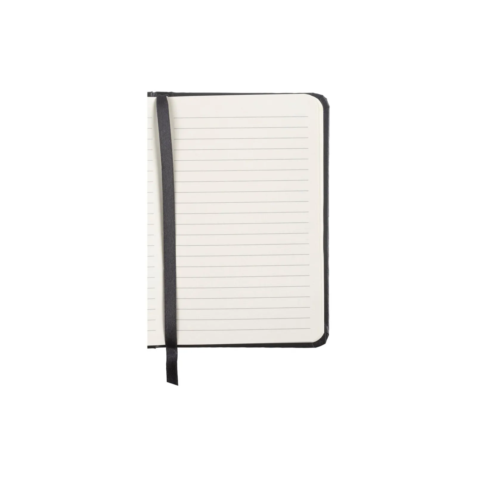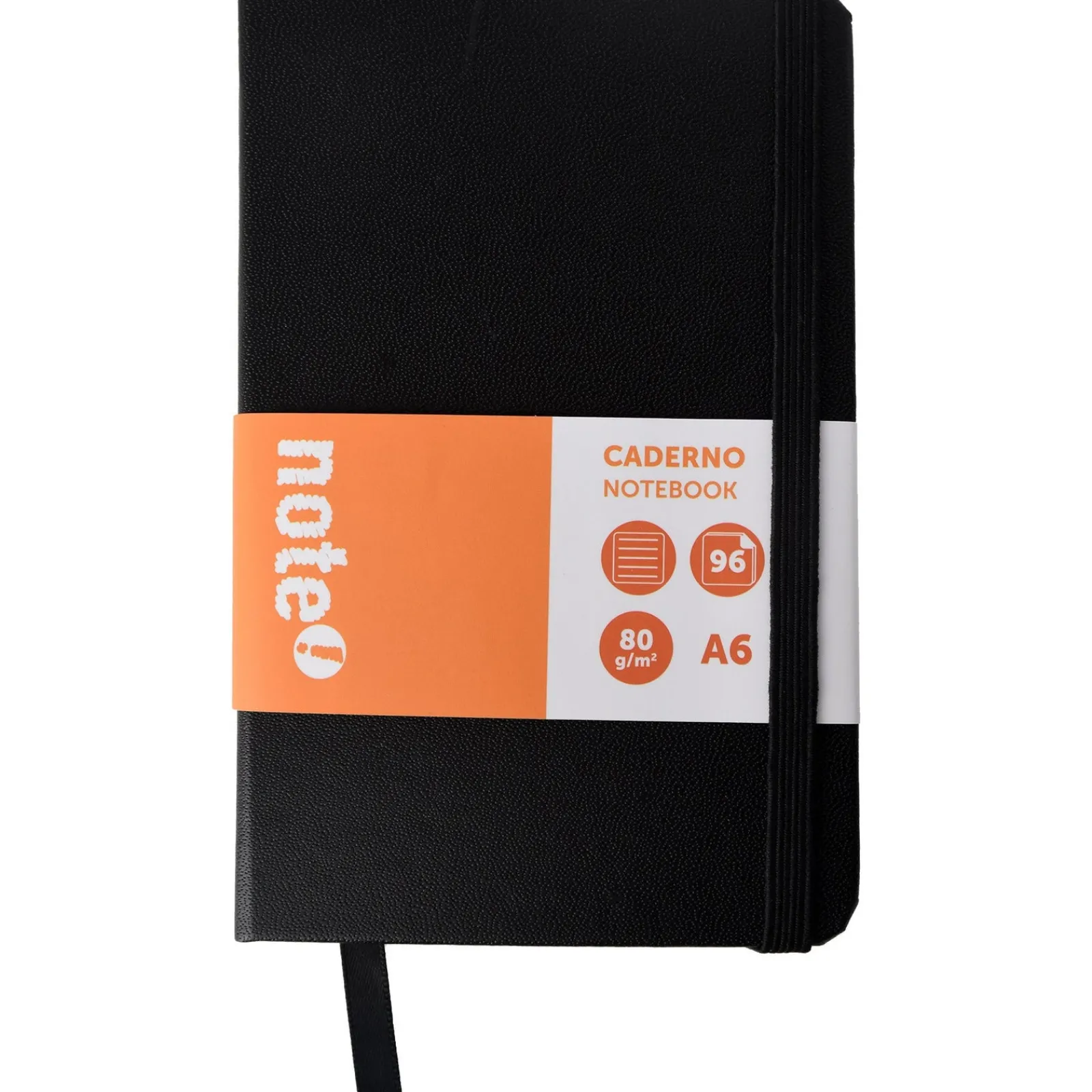 Caderno pautado agrafado A6 com capa dura e cantos arredondados. Inclui elástico exterior para manter o caderno fechado protegendo as folhas, e ainda uma fita marcadora no interior. O caderno tem 96 folhas com gramagem de 80g/m2.