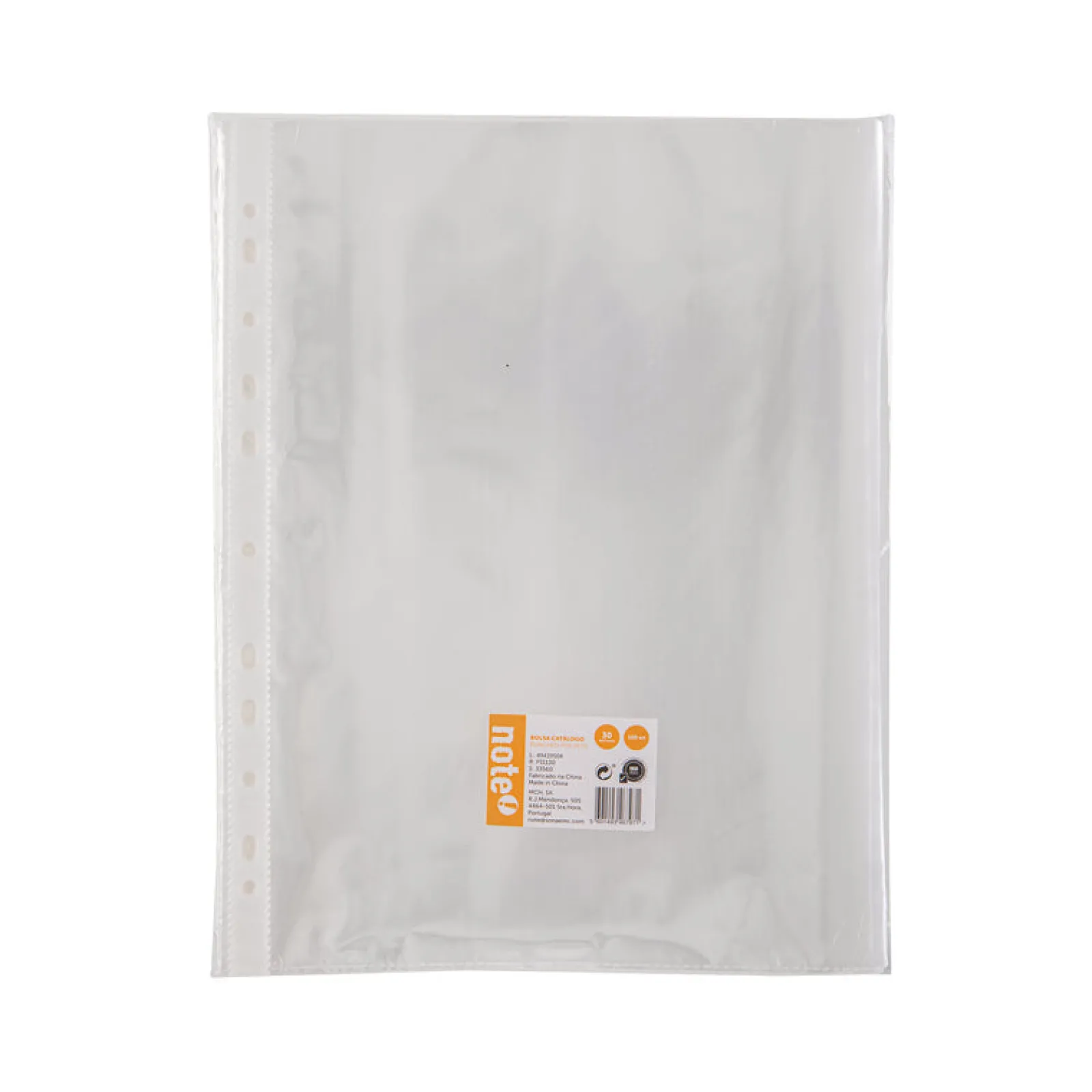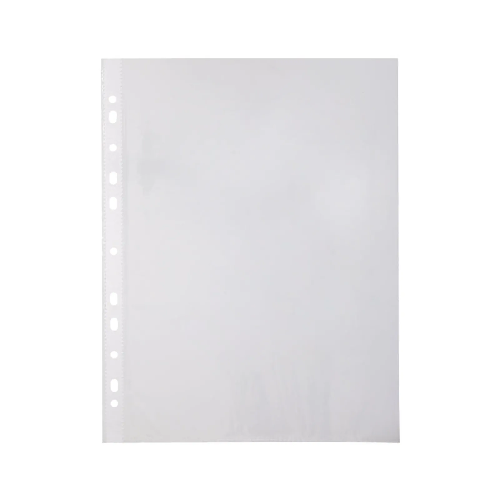 Conjuntos de 100 bolsas catálogo transparentes com espessura de 30 microns efeito cristal. Bolsas com abertura superior e perfuradas na lateral para arquivar em pastas de argolas.