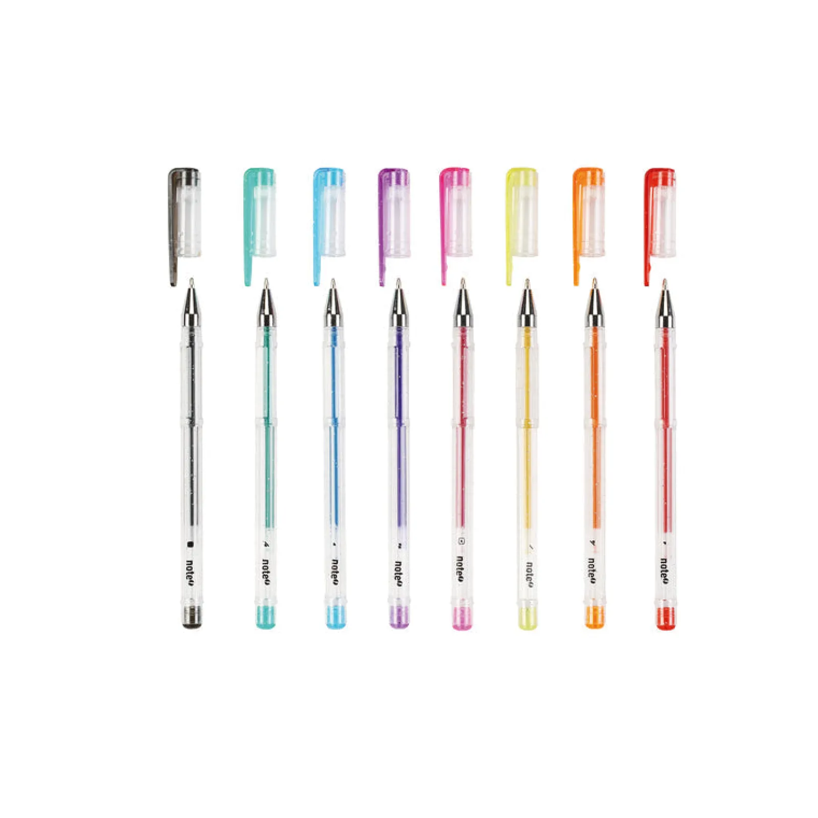 Conjunto de 8 esferográficas de tinta de gel de cores glitter de traço grosso de 1mm. O fluxo de tinta fluído permite uma escrita confortável e suave. A pega macia torna a esferográfica mais ergonómica e a tampa tem um clip na ponta para prender nas folhas.