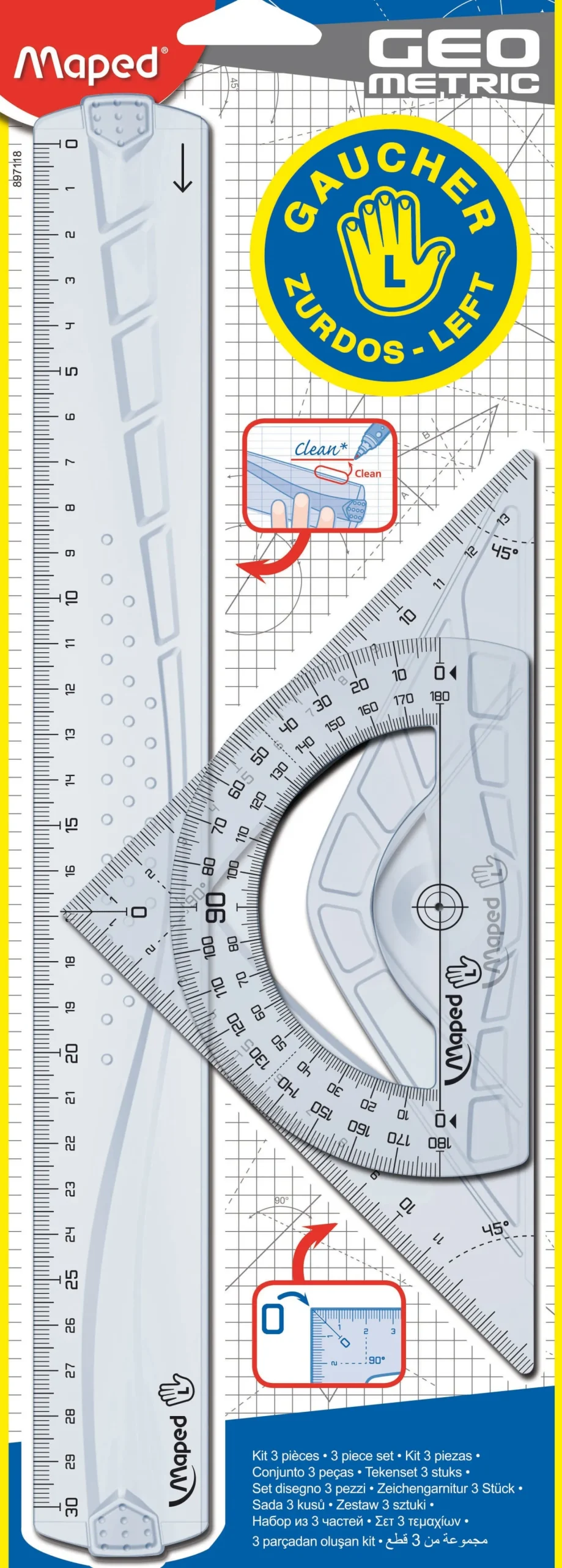 Conjunto para esquerdinos com régua de 30cm, esquadro com 13cm e transferidor.