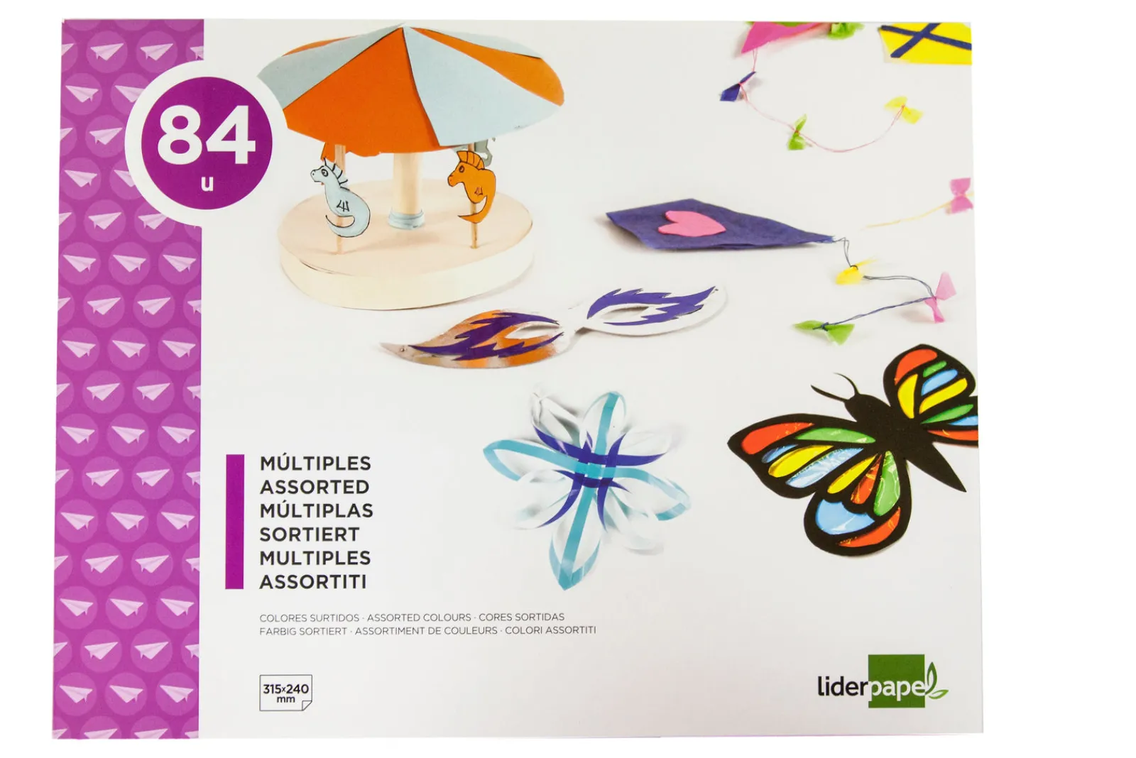 Cor: Cartolina Verde Claro, Azul Claro, Amarelo, Rosa, Branco, Laranja, Verde Escuro, Vermelho, Azul Escuro e Preto; Papel de Lustro Vermelho, Verde, Azul, Amarelo, Branco, Laranja, Castanho, Rosa, Azul Escuro e Preto; Papel Celofane Transparente, Vermelho, Verde, Azul, Amarelo, Laranja, Rosa, Roxo, Fucshia e Preto; Cartolina Metalizada Dourado, Prateado, Vermelho e verde; Papel de Seda Azul, Verde, Amarelo, Laranja, Branco, Vermelho, Rosa, Azul Escuro, Verde Escuro e Preto.