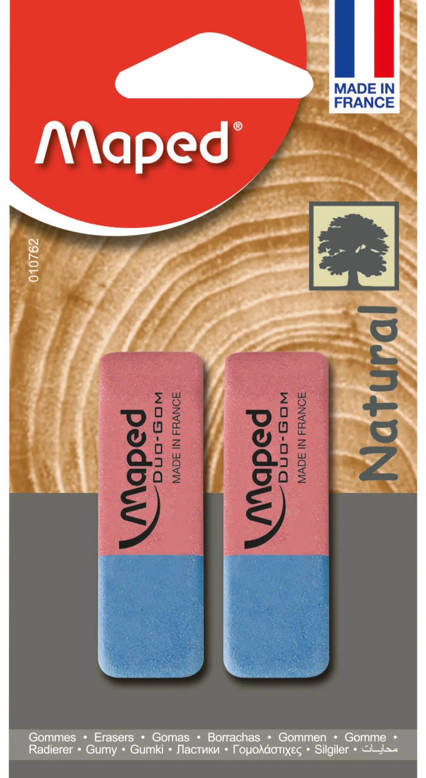 Borracha com dupla utilização: a parte rosa é indicada para apagar lápis de carvão ou grafite, enquanto que a parte azul é indicada para apagar tinta de caneta. É assim um instrumento completo, ideal tanto para o uso escolar como profissional. Feito com material natural.